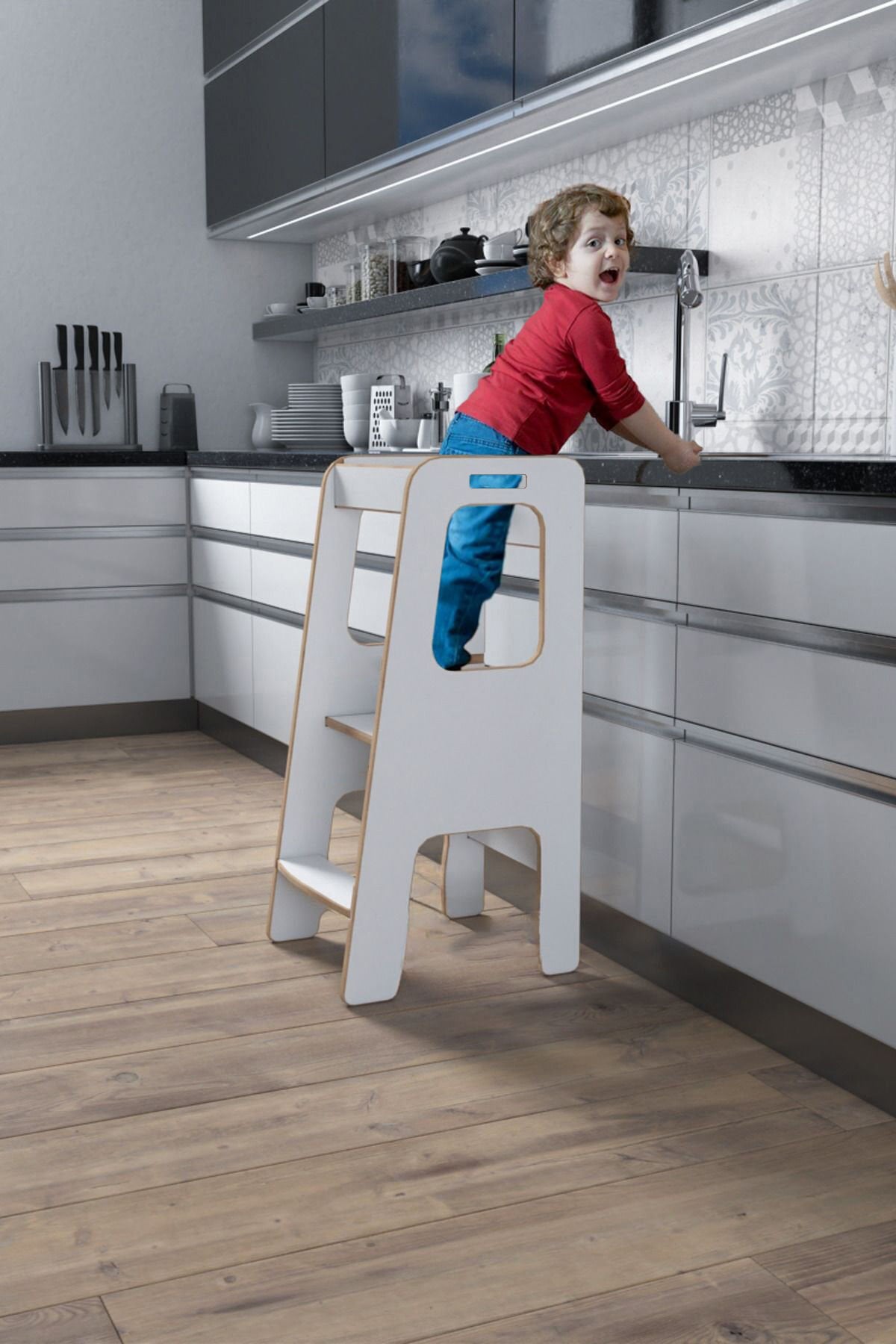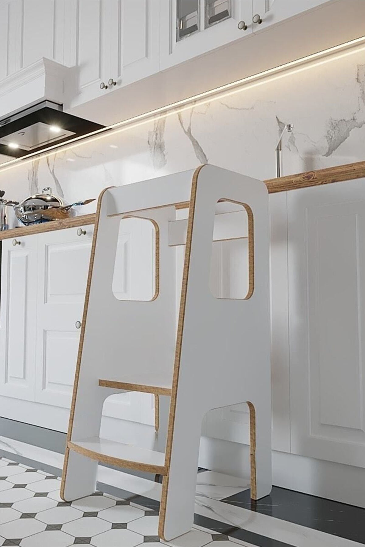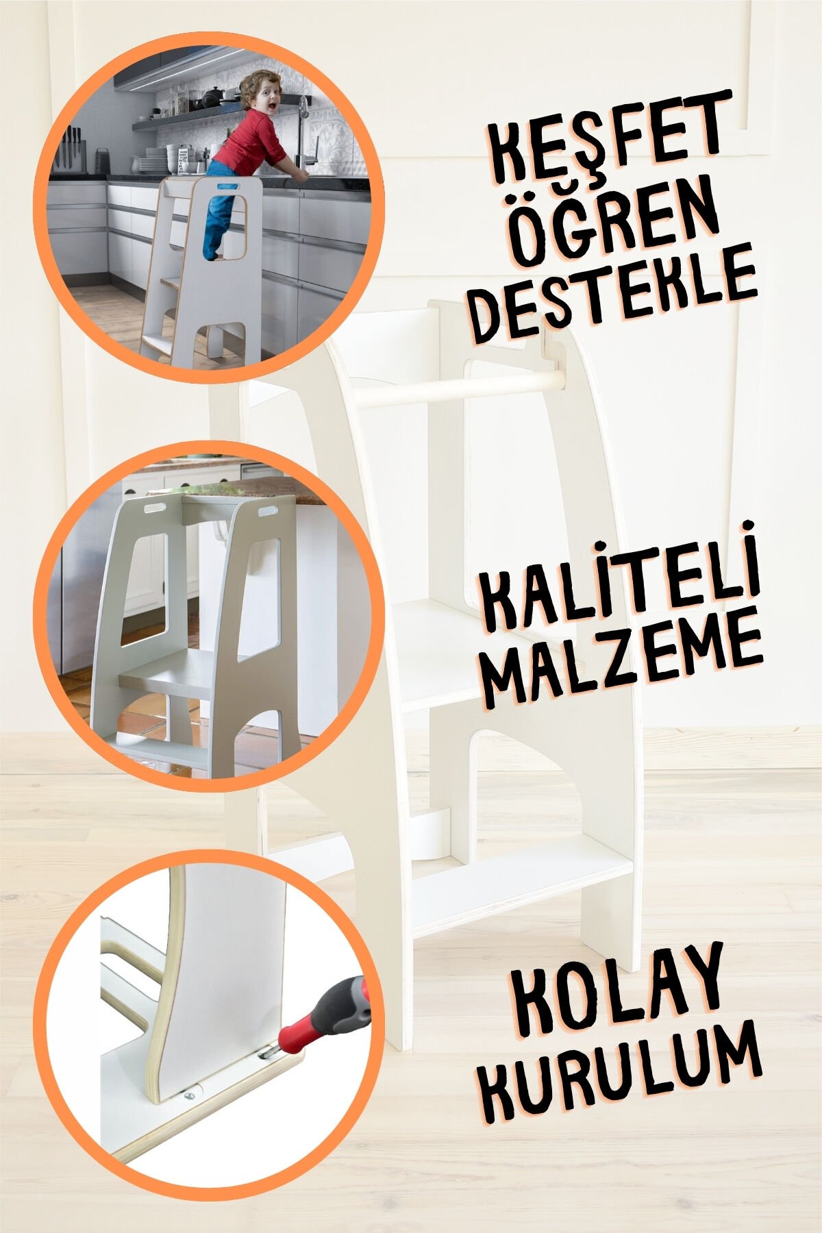 Mutfakta çocuğa yardımcı olacak bu kule, çocukların tezgah seviyesine erişmelerini sağlar, böylece onların yemek yapma süreçlerine katılmasını kolaylaştırır. Aynı zamanda, çocuklar için eğlenceli bir aktivite alanı sunar, onların yaratıcılıklarını ve hayal güçlerini geliştirir.