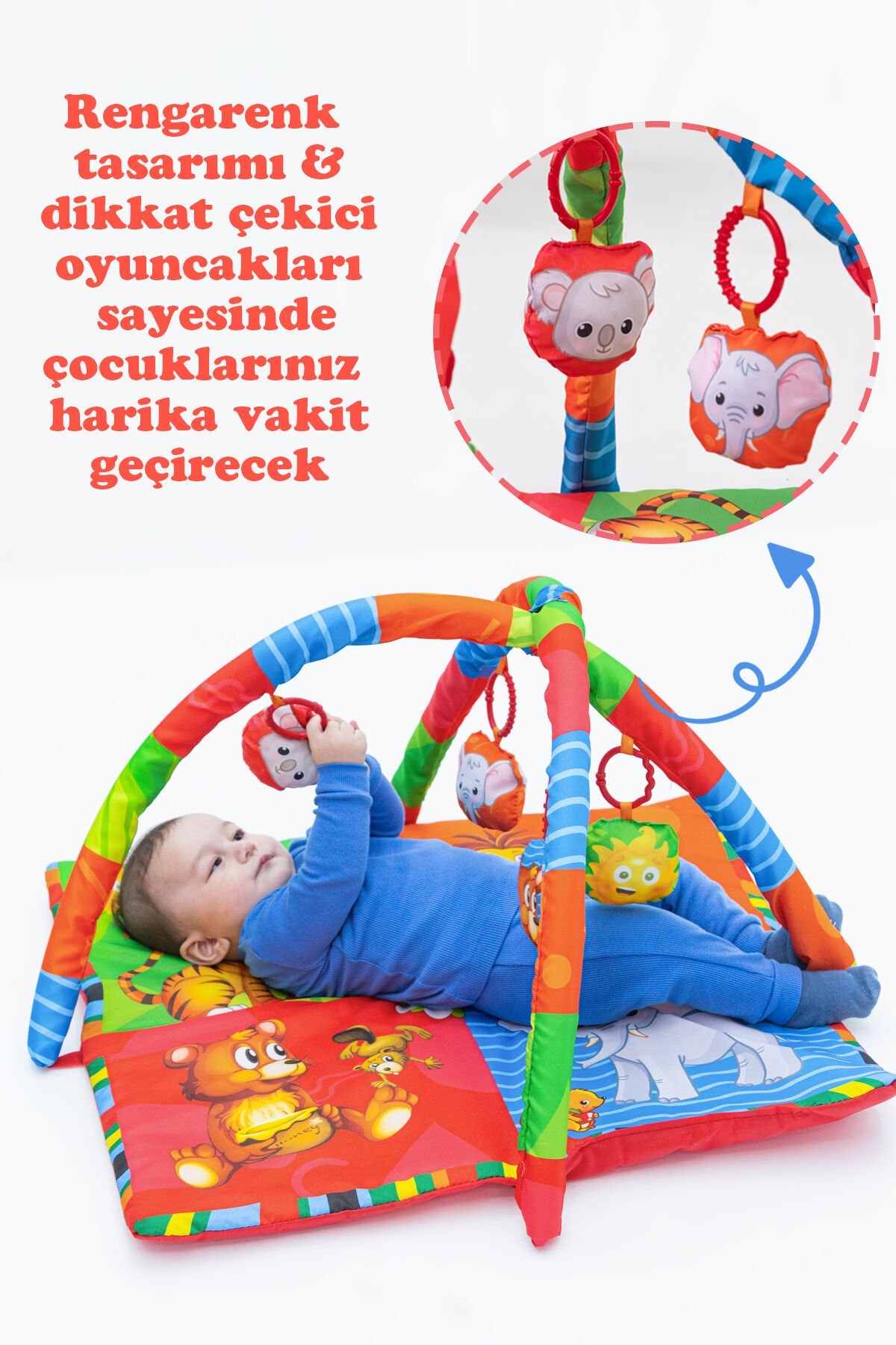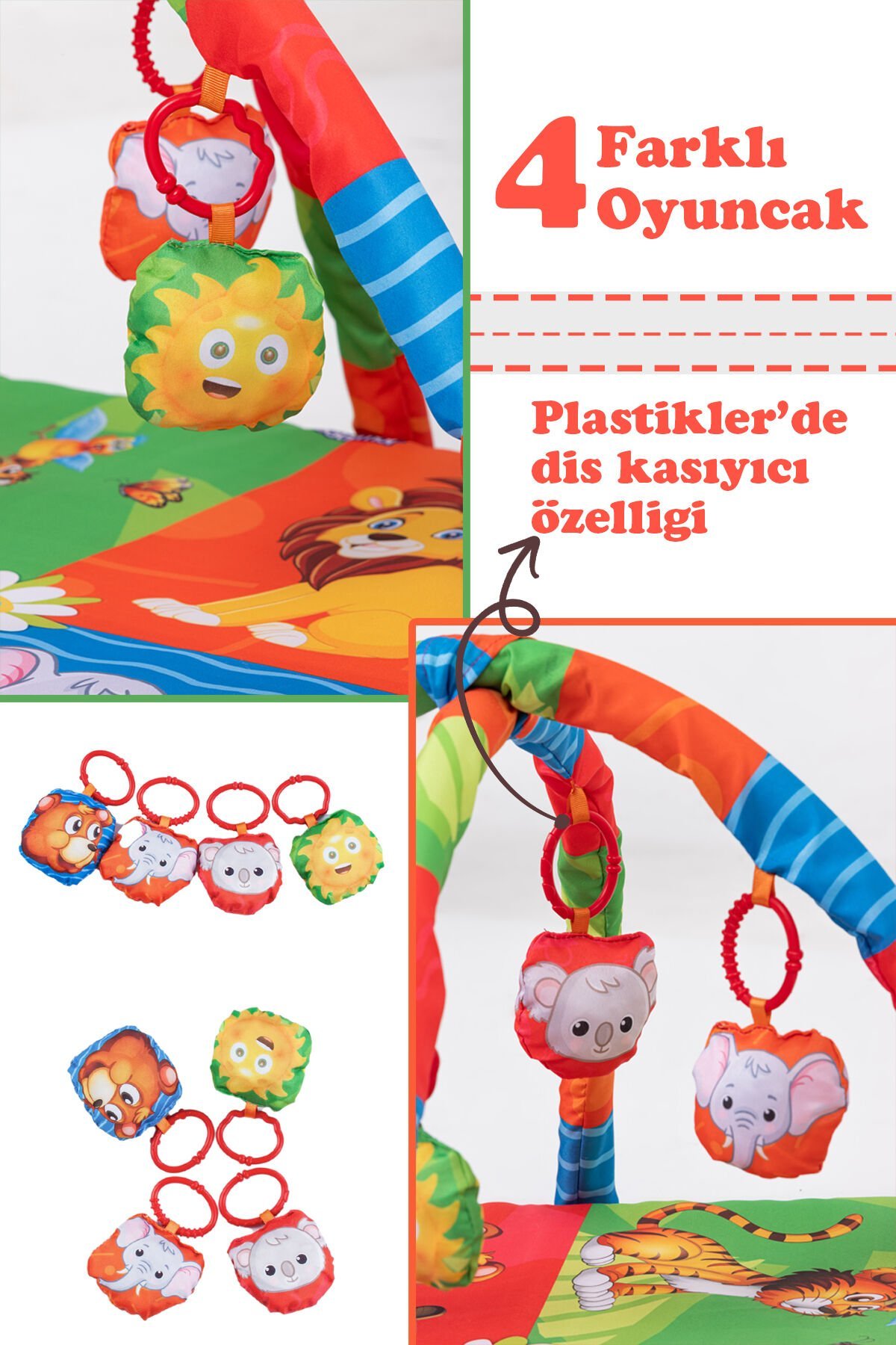 - Ürün üzerinde 4 Adet farklı hışırtılı oyuncak ve diş kaşıyıcı bulunmaktadır.