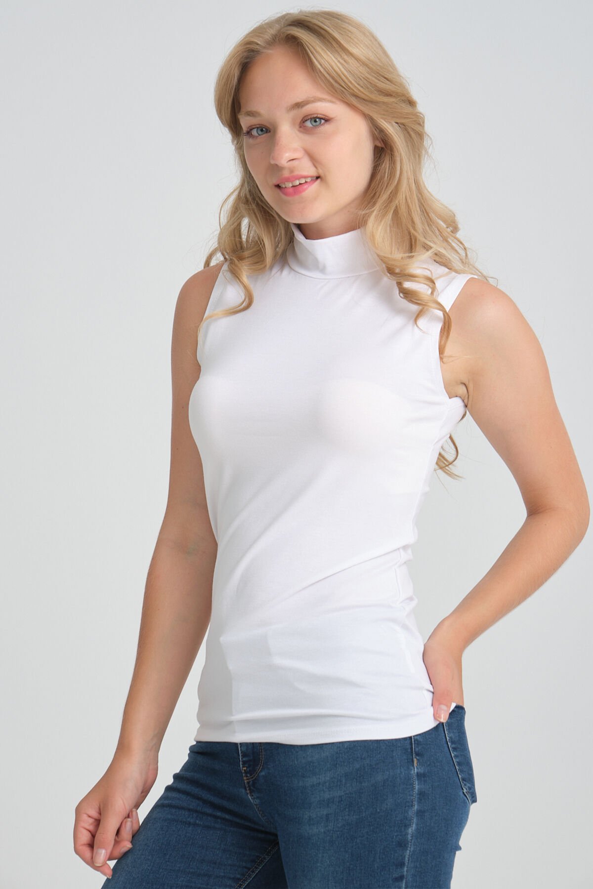 Örme Penye Dik Yaka Kolsuz Kurtarıcı Sıfır Kol Body Tunik L - Beyaz